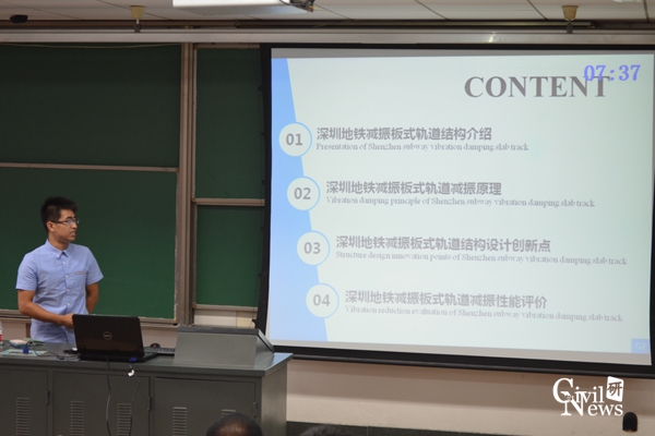 接下来,14名参赛选手依次登台演讲,选手们的演讲内容大多以自己的主修专业展开,也有部分同学另辟蹊径。首先上台的是一位桥梁专业的选手,他以“玻璃桥”为话题,借用一张张简洁、明朗、富有活力的幻灯片,在一开始就将比赛气氛带动了起来。之后,选手们的演讲愈发精彩,话题从隧道专业的隧道抗减震、围岩与隧道结构相互作用、盾构隧道掘进试验,到桥梁专业的桥梁美学、桥梁设计创新,再到铁道专业的CRTSⅡ板式无砟轨道、减振轨道结构等等,选手们都充分展示了自己的对专业知识的把握。同时还有两位选手以“思考”和“科学精神”为话题,以其发人深思的演讲引发了评委老师和观众们的思考。