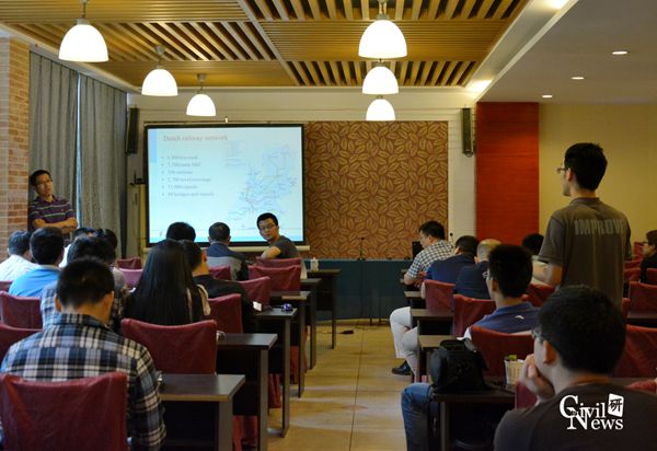 首先,李博士对代尔夫特理工大学进行了简单介绍,代尔夫特理工大学成立于1842年,是荷兰最大的工程大学,共8个院系,20000名学生,其中国际留学生3000名左右,教职工2668人。然后对该校轨道方向的研究小组做了介绍,并表示欢迎我校学生前去交流访问。随后,李博士介绍了荷兰铁路网的走向、布局等方面内容。接下来,李博士重点对钢轨短波不平顺问题进行了具体阐述。短波不平顺主要存在于直线或缓和曲线。它受到广泛的关注的原因主要有两方面原因。第一,它加剧了车辆——轨道系统的振动,从而产生高频轮轨动态接触力,导致车辆轨道系统的主要部件加速劣化。第二,高频接触噪声影响着生活在铁路沿线的居民。此外,它还可能引起滚动疲劳(RCF)。预防性打磨似乎是唯一有效的对策,然而,打磨增加了维护成本,减少铁路网络的可用性。因此,三维有限元车辆——轨道相互作用模型被用于研究不平顺的发展的机制,李少光博士对模型及计算结果进行详细了介绍。