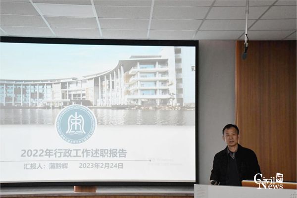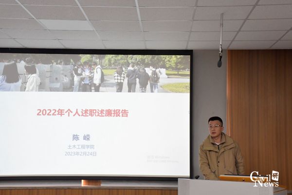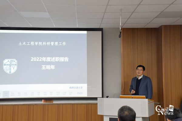 工作报告和个人年度述职。蒲院长系统的从学校师资力量、人才培养、科学研究、实验室建设、对外合作交流情况、学生管理、资产管理与环境提升几个方面做了总结汇报,并表示在第五轮学科评估中,土木工程学科发展取得新突破,同时也强调,在后交通时代加快传统土木学科转型升级的必要性与紧迫性。