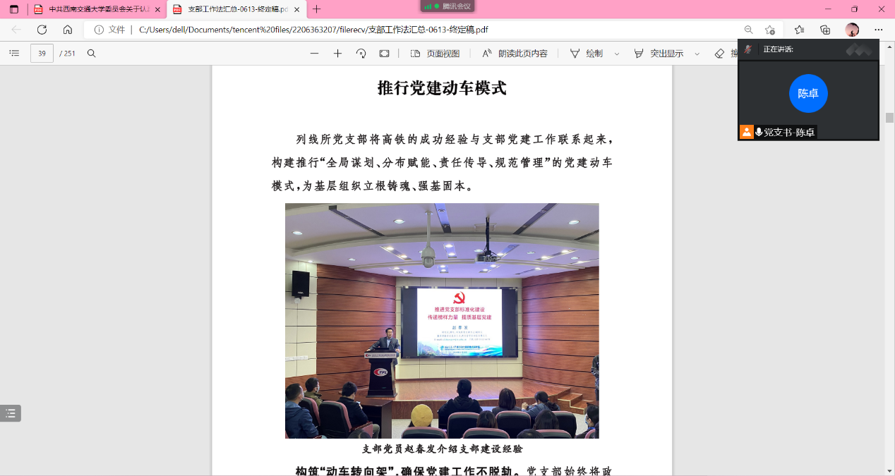 会上,党支部书记陈卓介绍本次专题学习活动的主要流程,并选取《四川省高校“优秀支部工作法”》中西南交通大学牵引动力国家重点实验室列车与线路研究所党支部的“三抓三筑三提升”工作法作为学习重点。
