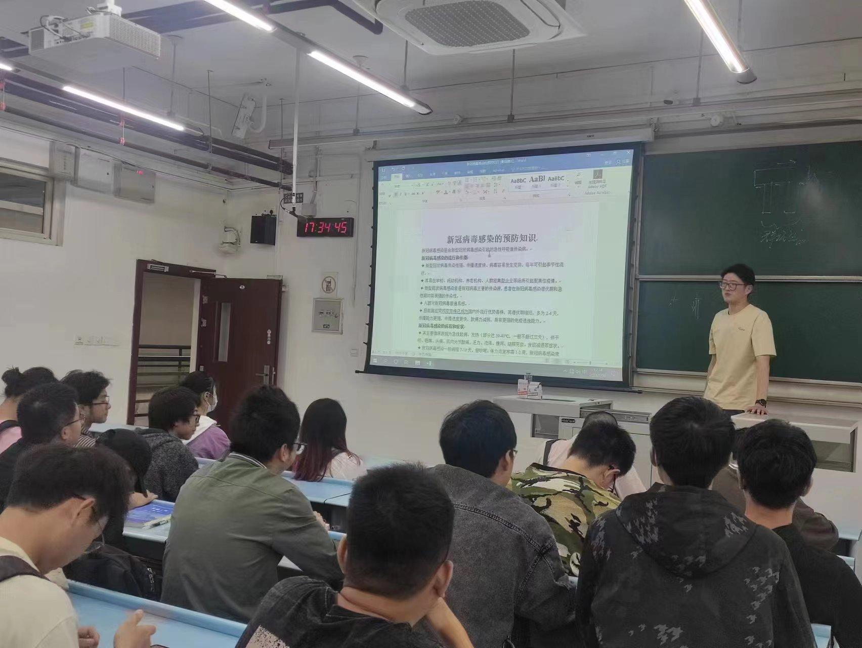2023年5月10号下午,在二号教学楼X2533,城市地下空间工程专业的同学们学习预防新冠病毒知识。本次班会通过WORD呈现的方式给同学们详细介绍了新冠病毒的流行和传播途径、感染的病程和症状,以及如何有效预防。通过这次的班会课的开展,同学们对新冠病毒感染的预防有了更为客观、全面的认识,防范与规矩意识整体提升,同时也强化了同学们对于“每一名同学都是自己健康的守护者”的意识,在一定程度上缓解了同学们疫情之下焦虑恐慌的心理,使得同学们能以更加积极的心理状态面对学习、生活。