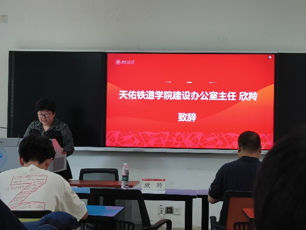 建设办公室欣羚主任上台致辞。她首先对进入詹班同学表示了祝贺。并向同学们介绍了铁道詹天佑班的历史渊源,詹天佑班是学校为了弘扬詹天佑精神,激励交大青年学子热爱祖国、发奋图强、刻苦学习、勇于创新,培养立志为铁路现代化建设服务的优秀人才所设立的。