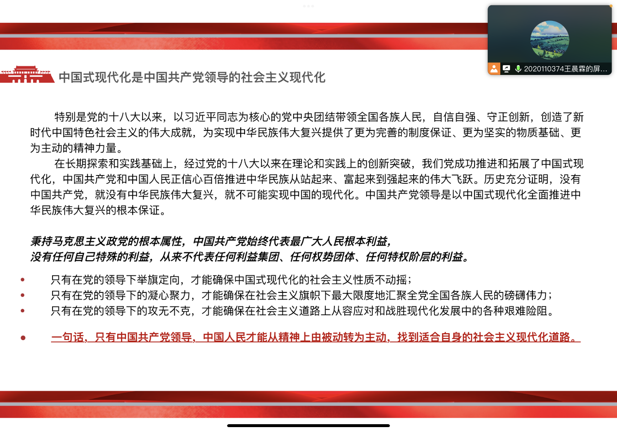 为深入开展学习贯彻习近平新时代中国特色社会主义思想主题教育,7月7日晚8点,土木学生第二党支部召开支部党员大会,支部书记王晨霖为支部全体党员讲专题党课,本次教育主题为“中国式现代化必须坚持中国共产党的领导”。