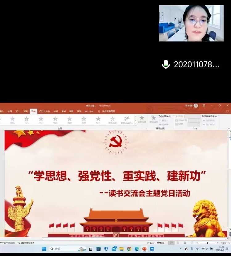 2023年7月8日晚20:00,为深入学习贯彻习近平新时代中国特色社会主义思想,土木学生第八、第九党支部利用腾讯会议开展了“学思想、强党性、重实践、建新功”读书交流会主题党日活动,原原本本学习中央主题教育制定学习材料,做到真学、真懂、真信、真用,在以学铸魂、以学增智、以学正风、以学促干方面取得实实在在成效,不断夯实团结奋斗的思想政治基础。土木学生第八、第九党支部的全体党员同志参与了本次学习活动。