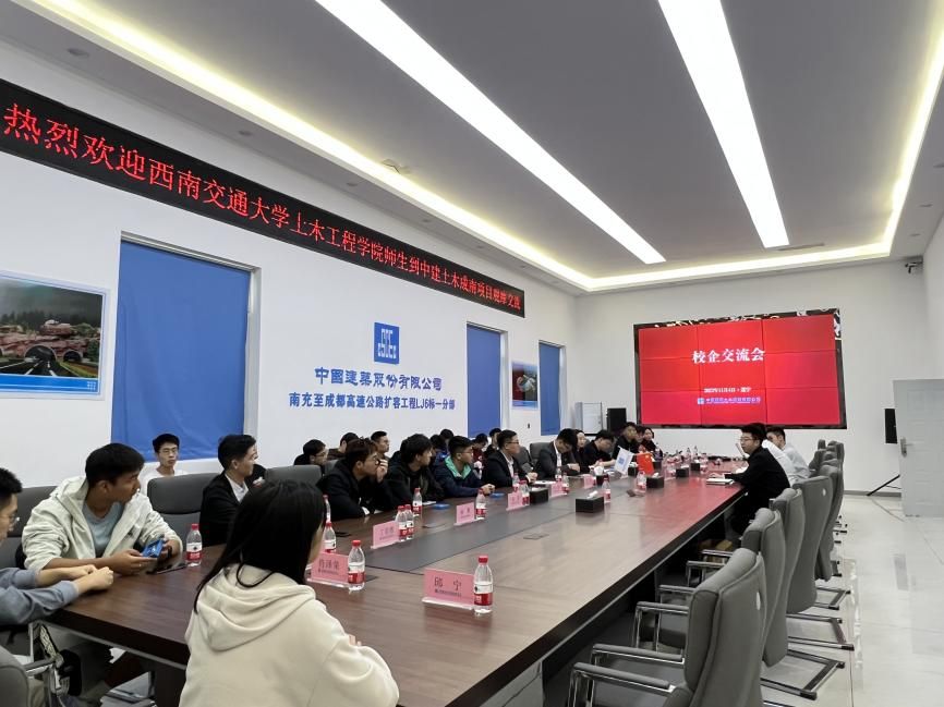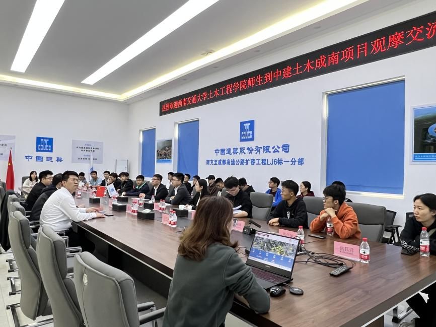 师生回到项目部会议室与企业进行座谈交流。会中,同学们踊跃发言,纷纷提出自己对于土木行业的疑惑,中建土木西南公司综合办公室主任、足球盘