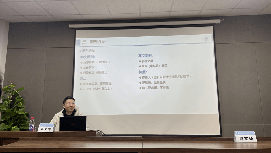 在期刊选择方面,郭师兄介绍了SCI、EI和核心期刊的基本常识和投稿流程,并针对中文期刊和英文期刊逐一分析了各自在格式要求、见刊速度和认可度方面的特点,推荐硕士研究生同学优先选择英文期刊。此外,郭师兄建议研一同学在论文投稿上,依次按照一篇中文核心,一篇中文EI和多篇高质量SCI的顺序进行撰写,这样可以让自己跳出舒适圈,逐步提升自己的科研能力。