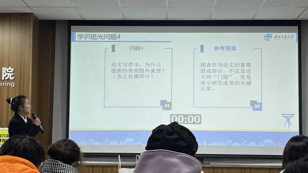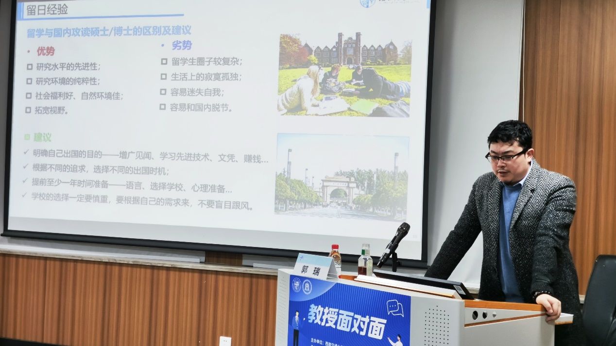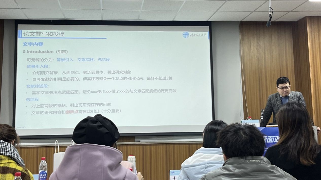 本次讲座邀请了郭瑞老师,围绕科研论文的撰写技巧、文章投稿的流程介绍和出国留学的经验分享等方面进行深入交流,向广大研究生同学传授科研基础知识,引导本校研究生基于学术志趣合理规划生涯目标,夯实科研能力,储备丰厚的专业技巧,树立坚韧不拔的科研毅力和浓厚的研究热情。