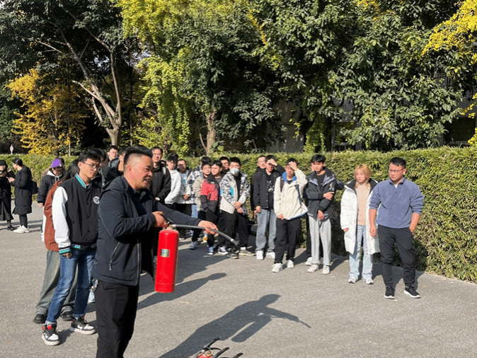 在实验室安全须知培训结束后,唐老师带领同学们前往户外场地开展灭火器的使用方法与实操培训。