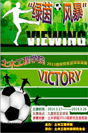 “绿茵风暴”2013级研究生足球友谊赛即将于3月17日(下周一)拉开帷幕,各参赛队领队请于3月12日22:00前将报名表送至眷诚斋13451宿舍王振同学处,逾期视为弃权。