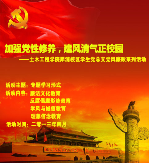 犀浦校区学生党总支特举办“加强党性修养、建风清气正校园” 党风廉政宣传教育系列活动。现将有关事宜通知如下:
