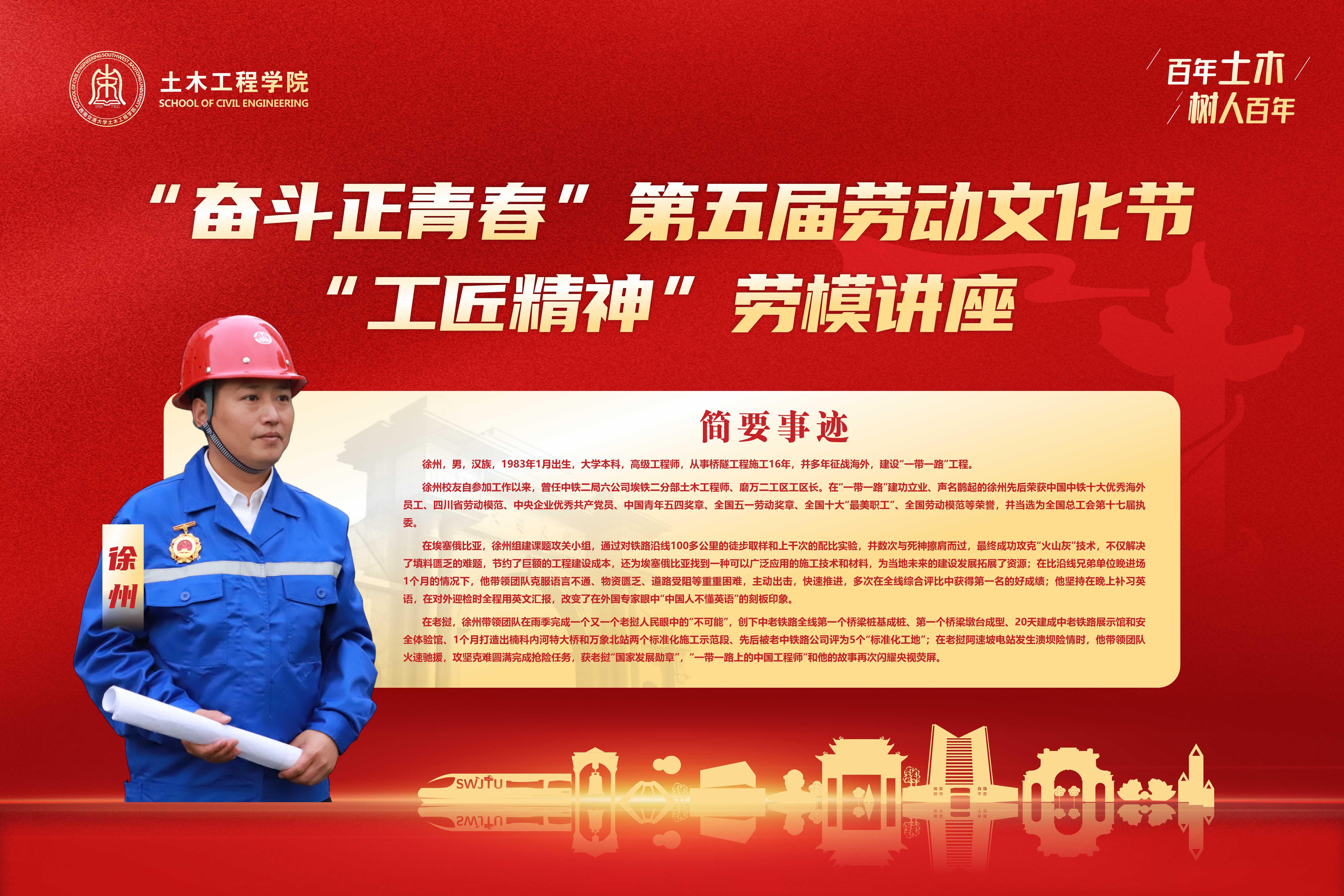 个人事迹:徐州校友从事桥隧工程施工16年,并多年征战海外,建设“一带一路”工程。他自参加工作以来,曾任中铁二局六公司埃铁二分部土木工程师、磨万二工区工区长。在“一带一路”建功立业、声名鹊起的徐州先后荣获中国中铁十大优秀海外员工、四川省劳动模范、中央企业优秀共产党员、中国青年五四奖章、全国五一劳动奖章、全国十大“最美职工”、全国劳动模范等荣誉,并当选为全国总工会第十七届执委。