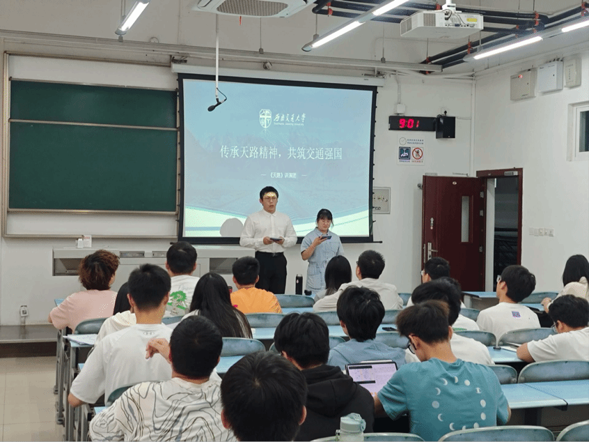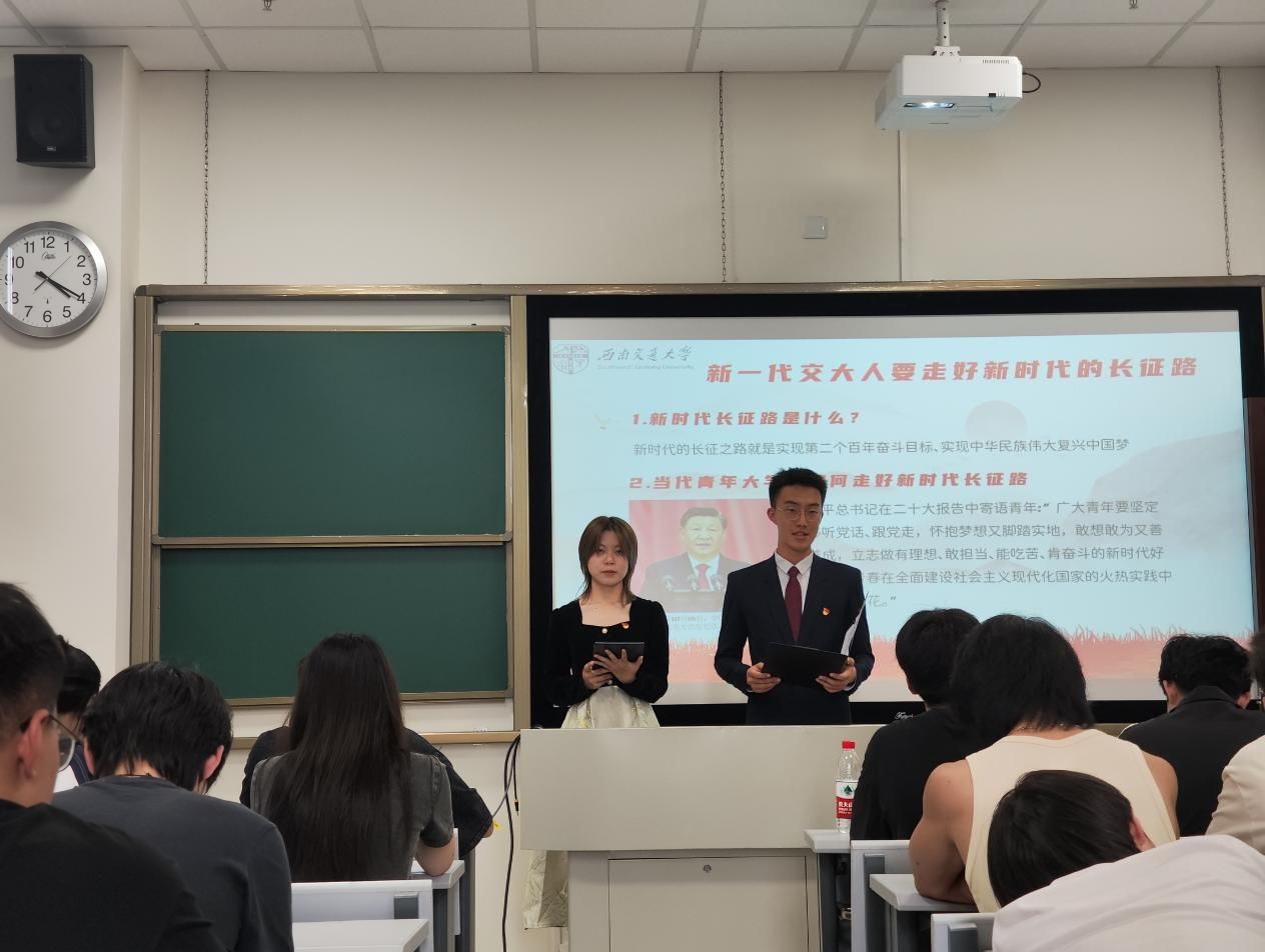 演讲团首先向同学们介绍了红军长征时的历史背景,并通过提问互动的方式让同学们对长征路有了更充分的了解。艺术团的同学们通过演唱红歌《红军不怕远征难》,表达了红军长征的不易与百姓们对国泰民安的期盼。演讲团也为同学们介绍了在新时代长征路中的交大人——有曾经引领国家基建领域的各方面专家,也有现如今奋斗在建设一线的交大学子。