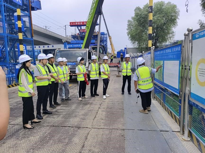 8月8日上午,实践队伍到达中铁一局建安公司,实地参观了西延铁路西安至铜川段西安枢纽联络线项目现场,直观感受了大型工程建设的震撼与管理细节。