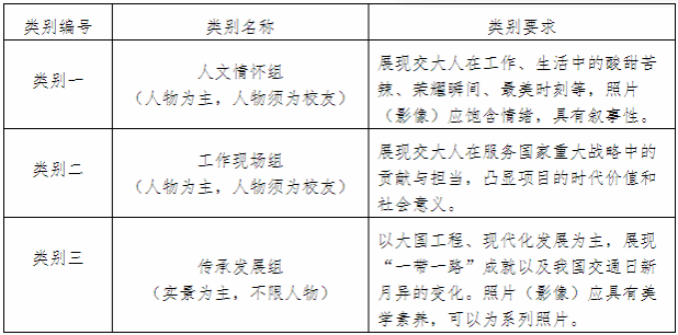 1. 本次活动按人文情怀、工作现场、传承发展三个类别征集照片及视频影像作品。类别一、类别二中人物须为我校校友,类别三拍摄者须为我校校友。