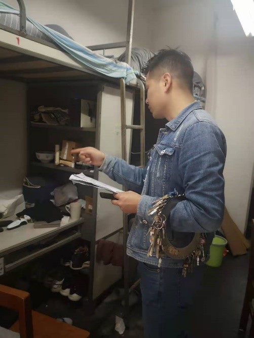 对所有研究生宿舍进行宿舍内务及安全隐患排查工作。博士辅导员商姚老师,硕士辅导员向京华老师、喻夏老师、魏源成老师带领研究生事务中心学生干部开展了本次检查工作。