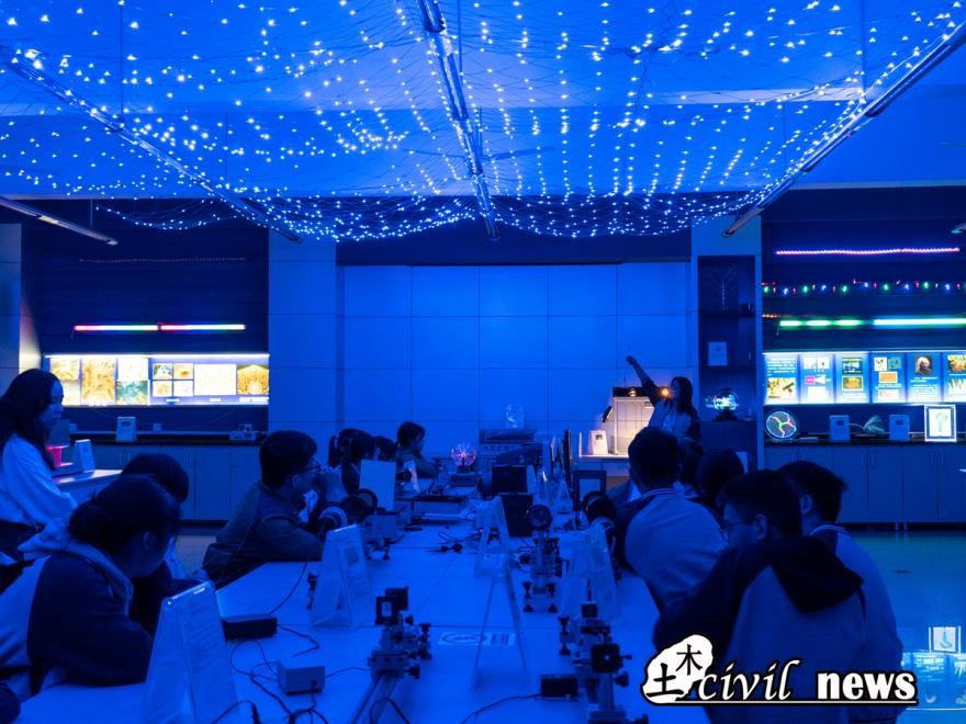 欢迎仪式结束后,本次研学之旅正式启程。第一站是物理国家级实验教学示范中心。在力学实验室里,同学们通过管理员对杨氏弹性模量实验、锥体上滚及动物下坡等的介绍与亲身体验,了解到现象背后隐藏的原理。在光学实验室里,蓝紫色的灯光下,这个实验室显得更具魅力,管理员对光谱灯、激光琴、台式皂膜等进行了介绍。