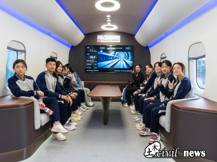 下午成实外师生一行乘车前往西南交通大学九里校区,来到高温超导磁悬浮列车试验线进行参观。进入试验线内部后,讲解员用通俗易懂的语言向同学们讲解了高温超导磁悬浮列原理与技术特征,并详细地介绍了西南交通大学高温超导磁悬浮交通研究进展,使成都市实验外国语学校学生对高温超导磁悬浮列车有了充分的了解。百闻不如一见,百见不如一行。接下来,成都市实验外国语学校师生分组乘坐高温超导磁悬浮列车试验线上的磁悬浮列车,切身感受磁悬浮科技的魅力。
