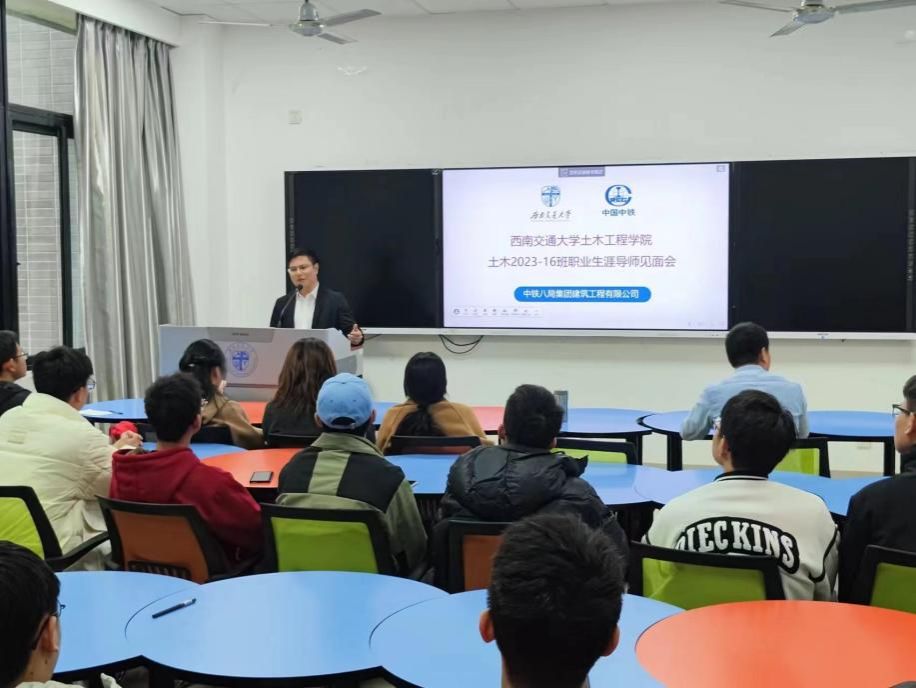 青年讲师团成员马云富和刘凌龙在西南交通大学犀浦校区四号教学楼X4137教室开展了企业生涯导师见面会。此次见面会旨在让同学们进一步了解当前就业形势,并且对中铁八局建筑公司有了进一步的深刻了解,提高了对土木专业的认知水平。