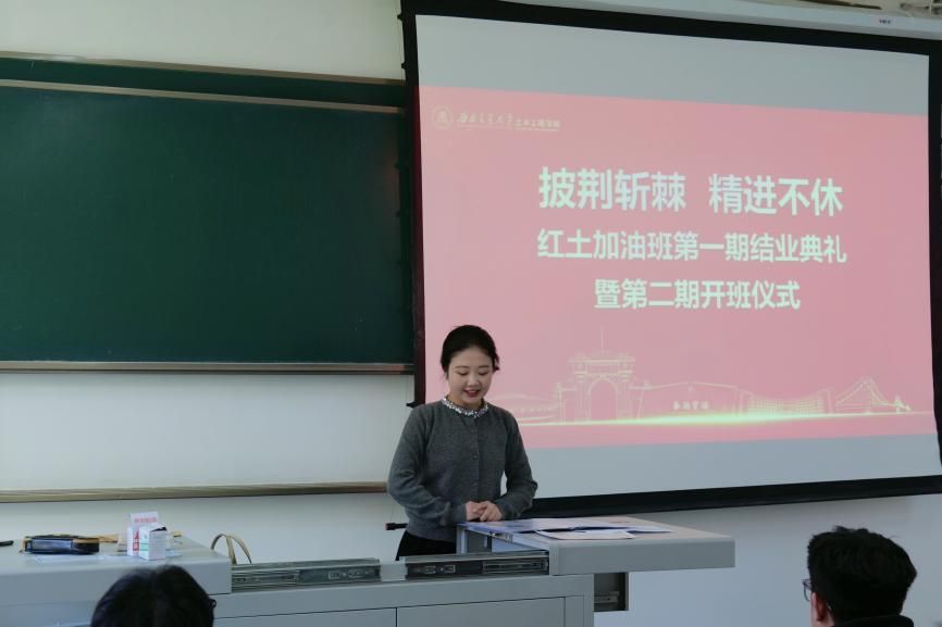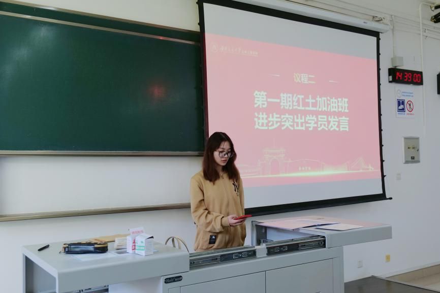 仪式第一项议程中,杨老师总结了第一期红土加油班取得的一些工作成效。她提到,在辅导员、专业老师、党员先锋帮帮团和学业监管助理四方合力,精准学业帮扶下,最初进入班级的33位退学预警同学,有25人成功退班,退班率达到 75.8%!杨老师鼓励在场第二期学员们千万不要灰心,希望他们斗志昂扬,带着为时不晚的冲劲,在这个班里好好学习。