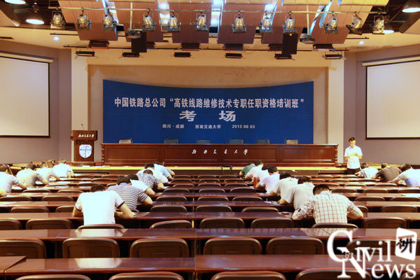 之后,在近2个小时的考试时间内,学员们认真答题,考场秩序井然。班主任刘贵郁老师介绍,此次考试的严格程度不亚于正式的国家资格考试,此次试卷由西南交通大学的老师命题,并交由中国铁路总公司相关部门审核,考试之前试卷的内容对外一律保密。她认为,随着国家高速铁路网的快速建设,高速铁路线路的维修管养工作越来越重要。为此,开展此次培训班的意义显得格外重要。同时,此次严格的考试也是对学员们专业知识的一种检验,确保他们能更好地服务于未来国家的高速铁路安全运营。