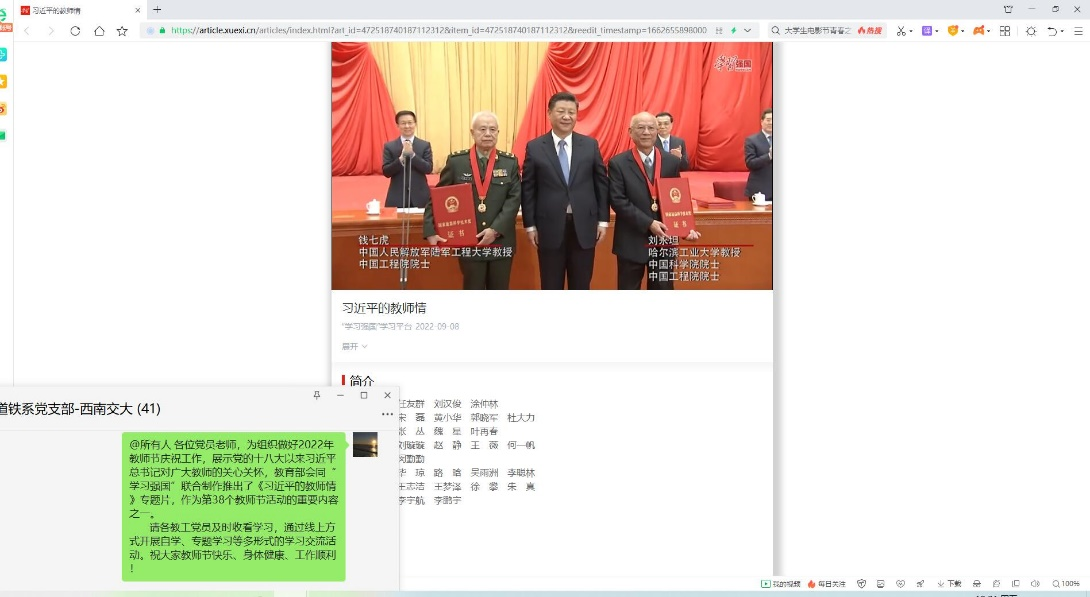 党委的组织下,我支部全体党员在线观看了教育部会同“学习强国”联合制作推出的《习近平的教师情》专题片。专题片通过记录的方式回顾了十年来习近平总书记对教育事业的重视,对人民教师的尊重,从大学、职业院校到中小学,他走遍了全国各地,深入到教师和学生中间,关心教师、关心学生、关心教育。走访大学、和师生亲切地握手、给老院士颁发荣誉证书、给广大师生的回信中处处都展现了习近平总书记对教育的重视,对人民教师神圣职业的尊重。
