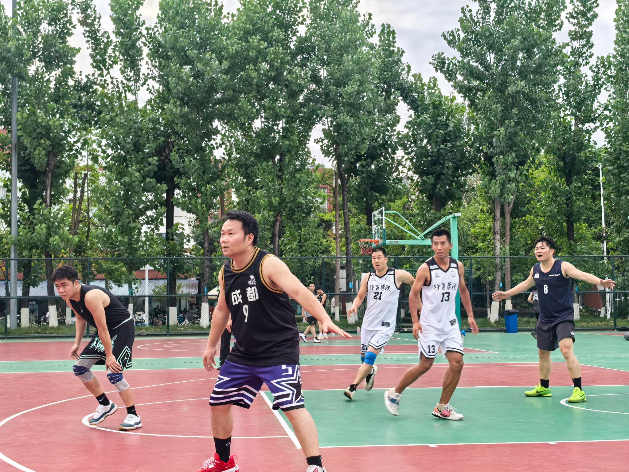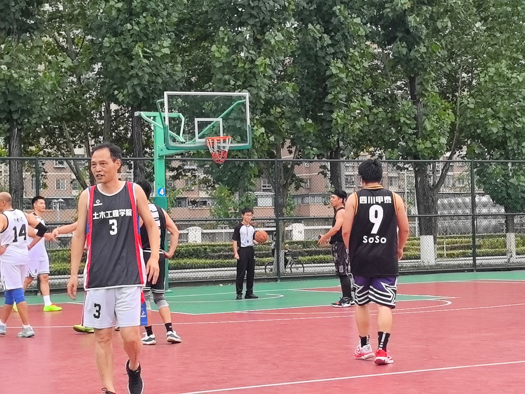 教职工队便将团队协作展现得淋漓尽致。训练时,领队石莹与教练陈远久会根据每位队员的特点,反复打磨战术配合,从挡拆掩护到无球跑动,每个环节都经过精心设计。比赛中,队员们凭借高度的默契,将战术执行到极致。面对对手的严防死守,他们没有单打独斗,而是通过不断地传球拉扯防线。后卫严涛精准的长传找到篮下空位的中锋严猛,后者轻松上篮得分;或是前锋陈昭吸引包夹后,及时分球给外线手感火热的崔凯、刘江,完成一记漂亮的投射。正是这种无私的分享球与紧密配合,让他们以小组赛全胜战绩昂首晋级。