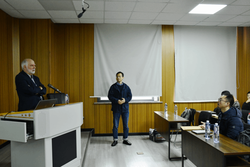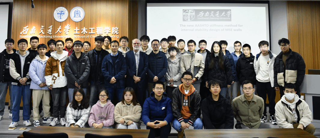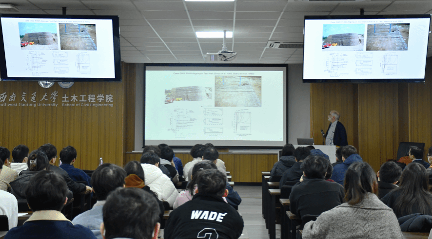 Richard Bathurst, Professor Emeritus of Civil Engineering at the Royal Military College of Canada and an overseas scholar under the initiative of Geotechnical and Underground Engineering Intelligent Construction and Safety Overseas Expertise Introduction Center for Discipline Innovation gave a lecture on the topic “The New AASHTO Stiffness Method for Internal Stability Design of MSE Walls” on December 11 at the building of School of Civil Engineering (SCE) on Jiuli Campus. Chen Rong, Deputy Dean of SCE, and Associate Professor Yang Shangchuan, together with a full room of teachers and students were present. The lecture was presided by Professor Yu Yan from SCE. He gave a warm welcome to Professor Bathurst who also holds a cross-appointment at Queen's University, and is a Fellow of the Canadian Academy of Engineering, the Engineering Institute of Canada, and the Canadian Society for Civil Engineering.