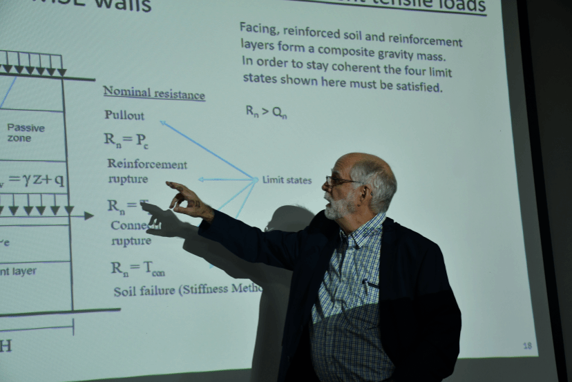 In addition to the essential features of the AASHTO Stiffness Method, Professor Bathurst explained how the method was calibrated against a large database of measurements, and how to compare the advantages and disadvantages of the two methods by statistical analysis. He pointed out the benefits of the AASHTO Stiffness Method, for example, it is more helpful to select reinforcement design parameters, remove conservatism observed in Simplified Method design outcomes, and facilitate load and resistance factor design calibration.