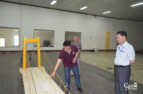 随后,王老师结合实验室中摆放的悬索桥模型从模型相似比、风速相似比、高精度位移监测设备及传感器、独立人员操作平台等方面阐述了风-模型在实验室中的实现过程,着重指出风工程模型试验的重点在于模型的几何尺寸和配重与原型结构的相似关系。除此之外,他还详细介绍了该实验室在涡流变层流处理、风力放大和风循环利用等方面的亮点设计,何处长均十分耐心的进行了听取。