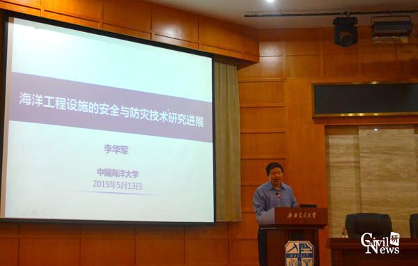 首先,李华军教授由海洋工程事故入手,讲述了近十年来的近百起海洋事故,现有海洋工程理论和分析方法不能满足新型深水工程的需求,需要进一步的发展研究。海洋工程结构物在不同的水深环境下,结构尺寸差异较大,且海洋工程设施种类较多,环境条件复杂。随后,李教授从海岸工程的研究与实践方面进行讲解,通过青岛奥帆比赛的例子,讲述了波浪数值模拟的方法。接下来,李教授又通过桥梁设计及实验的例子生动讲述了近海工程安全设计与防灾的研究方法以及深海工程面临的严峻挑战。