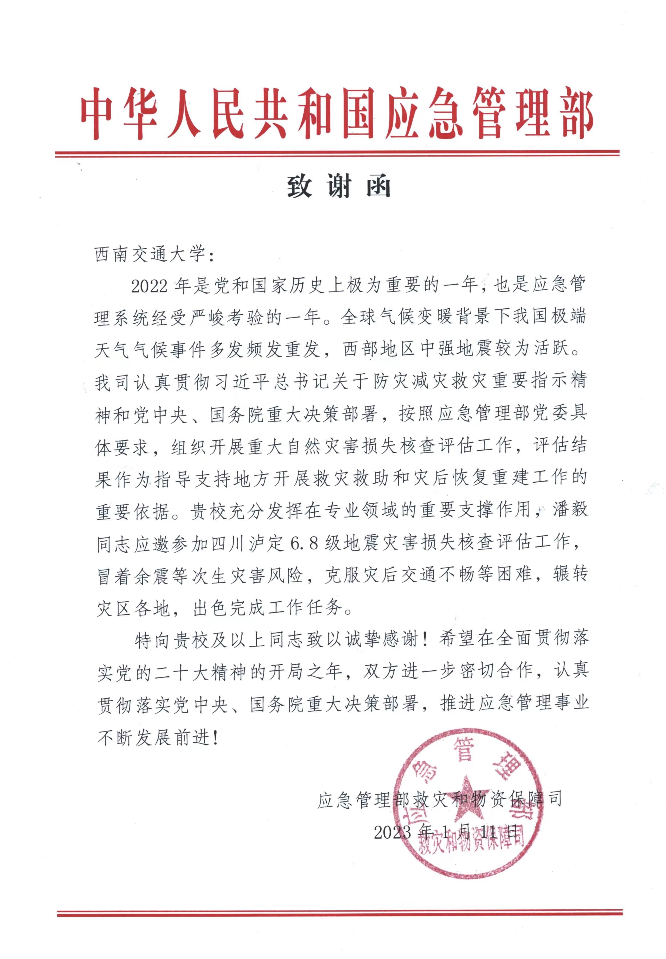 近日,国家应急管理部专门向西南交通大学致来感谢函,表扬足球让球盘