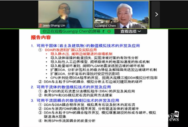 冯夏庭教授的讲座主题为深部工程岩体破裂仿真与稳定性分析——CASRock研发进展与应用,详细介绍其团队在CASRock软件上的研发进展与应用;陈光齐教授的讲座主要内容包括:可用于固体(岩石,土,建筑物)的数值模拟技术的研发及应用,可用于流体的数值模拟技术的研发及应用和可用于流固耦合的数值模拟技术的研发及应用三方面。国际著名数学、力学家石根华教授、中国工程院院士朱合华教授等知名专家学者参会。