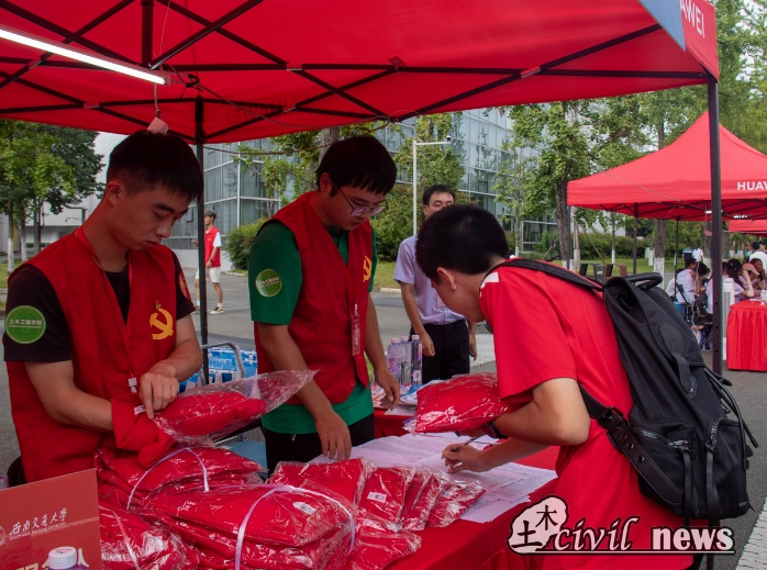 迎新点位上忙碌着。新生物资清点摆放,件件明晰;报到流程熟悉掌握,样样落实。志愿者和党员服务队的同学们各自分工,在迎新点位严阵以待,在辅导员的引导下有条不紊地进行新生身份核验、物资发放等工作。