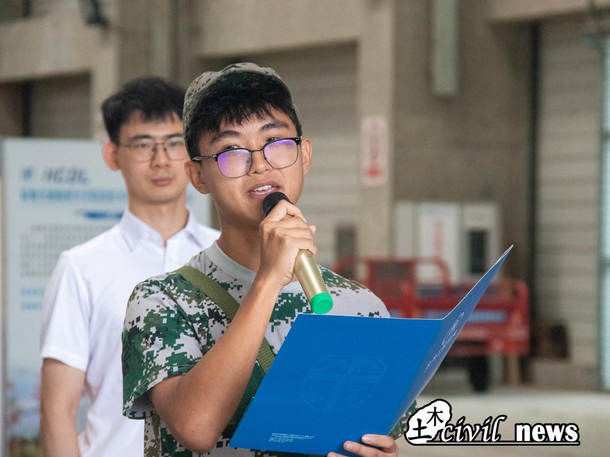 随后,蔡一鸣同学代表全体2023级军训新生们进行发言。他对中铁建工集团为同学们带来消暑降温物资表示感谢,同时也表达了同学们对圆满完成军训的决心和对校企合作的支持。“军鹰十连,翱翔九天;搏风抗雨,共创辉煌。”他表示,接下来将继续坚持在军训中以高标准要求自己、磨炼自己,与足球盘