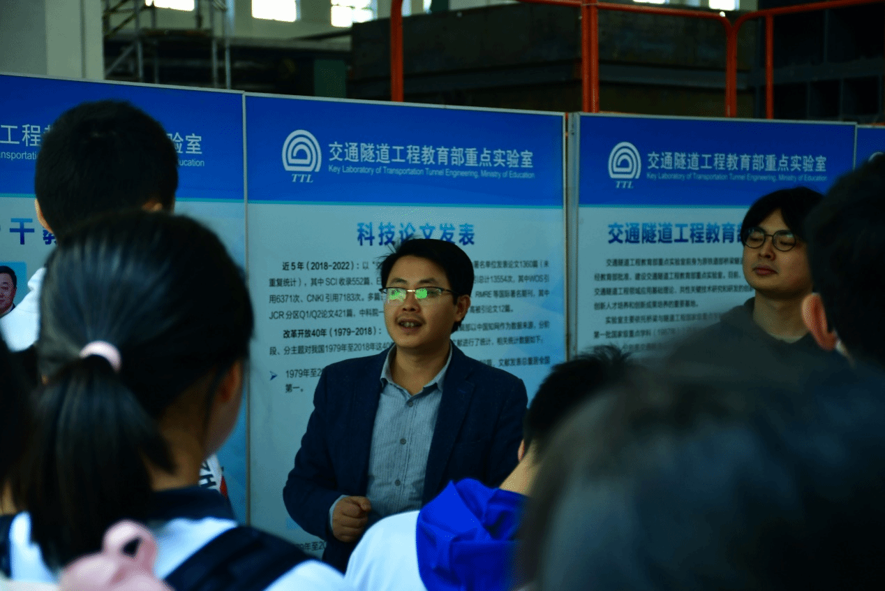 姚超凡老师在隧道研发楼对西川中学师生的到来表示热烈欢迎,随后走进交通隧道工程教育部重点实验室,介绍了实验室近年来取得的一系列成果。硕士研究生张逸飞深入细致地介绍了实验室的主要科研设备,大大激发了西川中学学子对隧道的兴趣,让他们更进一步感受到了隧道工程的魅力。