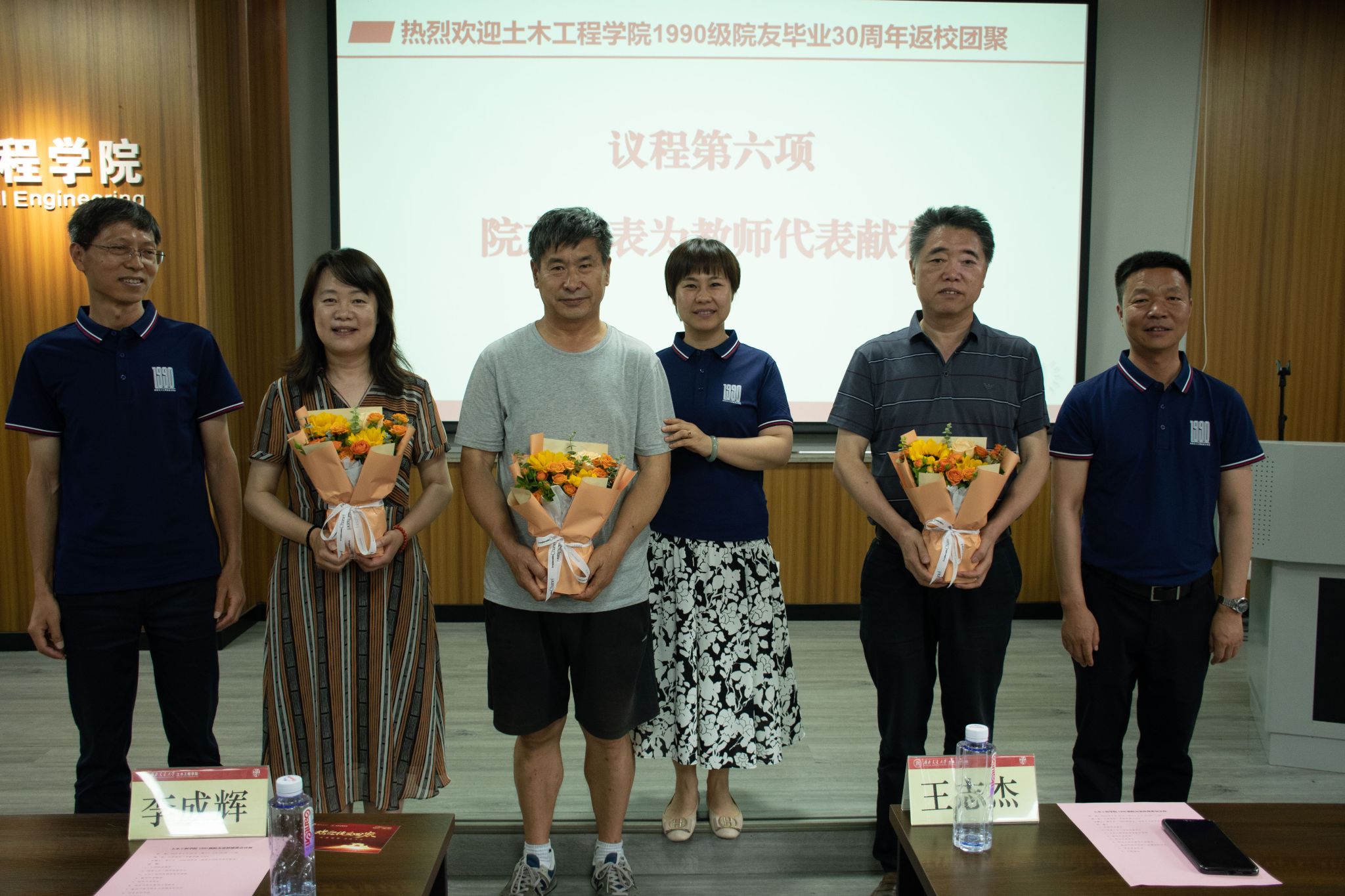 党委副书记兼副院长车小洁,教师代表李成辉、王志杰、杜赞华与五湖四海归来的土木院友们欢聚一堂,共叙往昔。本次座谈会由1990级院友、图学及BIM研究所教师葛宇东主持。