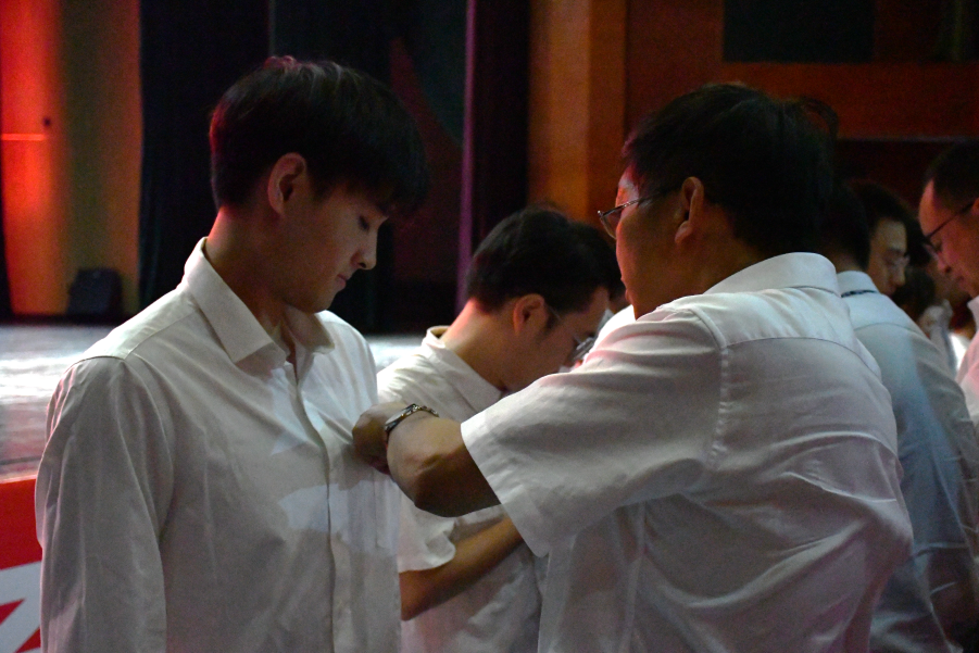 随后,在庄严的氛围中,全体新生佩戴土木足球盘