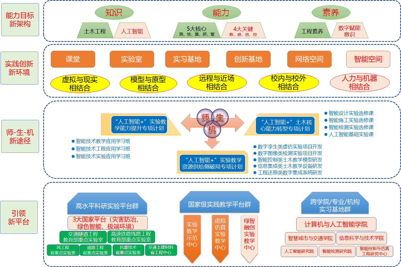 下一步,土木工程国家级实验教学示范中心(西南交通大学)将紧跟国家教育数字化战略行动、人工智能时代新趋势和新要求,以解决“智慧土木”人才培养的目标架构和实现路径为根本任务,重点围绕土木人才培养重点环节——实践创新能力的培养展开研究。以国家、民族发展对“智慧土木”的需求,来确立人才实践创新能力培养的具体目标;依靠课程建设、团队建设和基地建设来研究和打造“智慧土木”人才支撑平台;以建设三大类“人工智能+”专项计划作为实施路径核心环节的实现方法。用3-5年时间,构建出具有示范引领效应的“智慧土木”实践教学新模式。启动10个专项实验教学研究和改革工作,为重塑实践育人体系奠定坚实基础,力争在学生的实践能力和创新能力的提升中发挥更大推动作用。
