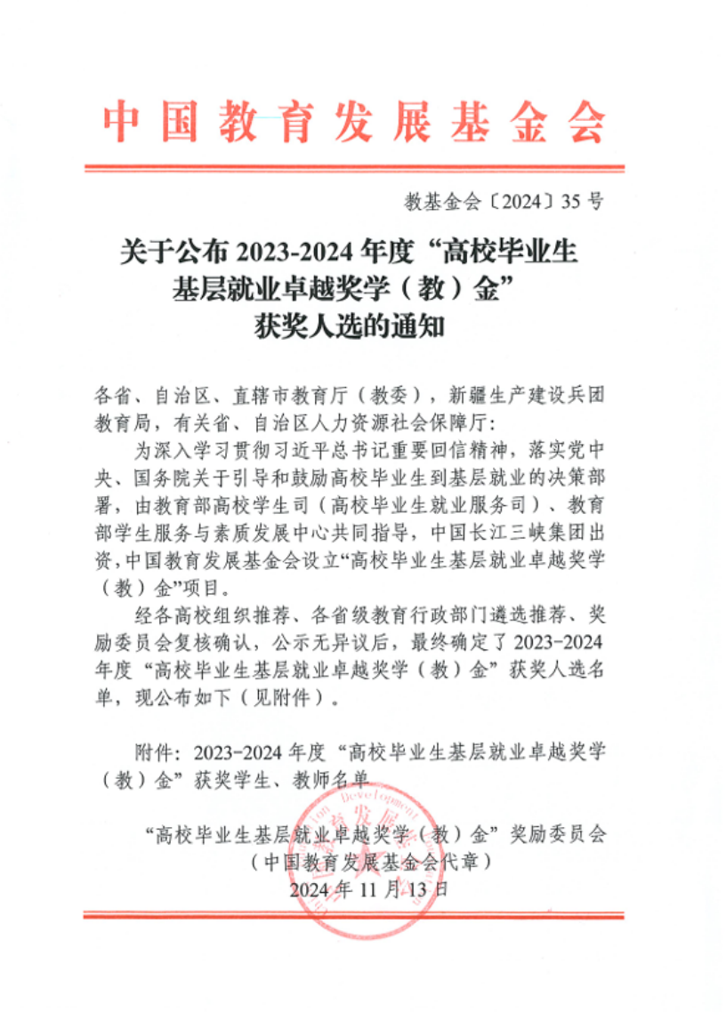 “高校毕业生基层就业卓越奖学金”由教育部高校学生司(高校毕业生就业服务司)、教育部学生服务与素质发展中心共同指导,中国长江三峡集团有限公司出资,中国教育发展基金会特设,旨在深入学习习近平总书记重要回信精神,贯彻落实党中央、国务院关于引导和鼓励高校毕业生到基层就业的决策部署,奖励赴基层就业创业并做出突出业绩的普通高校毕业生。2024年,全国共有398名优秀高校毕业生获得奖励。此次足球让球盘