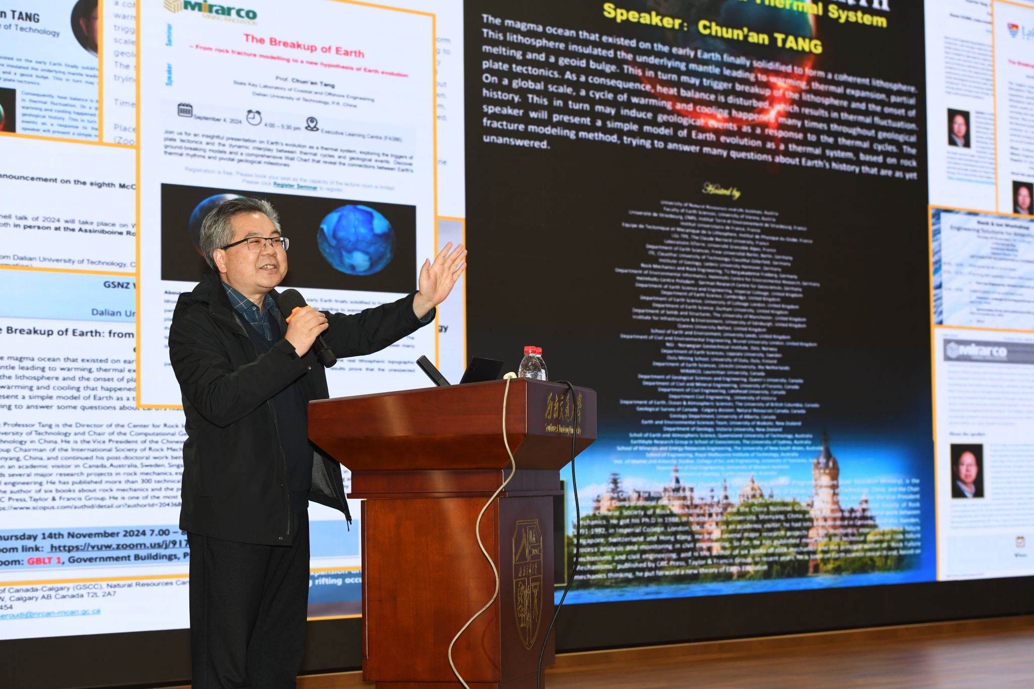 西南交通大学首席教授、中国工程院何川院士致欢迎辞。何川院士对唐春安教授的到来表示热烈欢迎和诚挚的感谢,并高度评价了唐教授在土木及地质工程与地球科学交叉领域的开创性研究。唐春安教授与西南交通大学关系源远流长,曾三次来访西南交通大学带来地球大龟裂学说的重要进展。他表示,唐教授的研究不仅具有重要的理论意义,还为防灾减灾、资源开发等实际工程问题提供了科学依据。