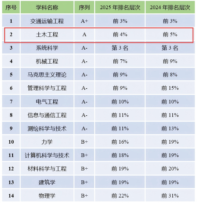 近日,高等教育评价机构软科正式发布“2025软科中国最好学科排名”。西南交通大学“土木工程”学科从2024年的全国第7位攀升至第6位,稳居A类,跻身全国前4%!