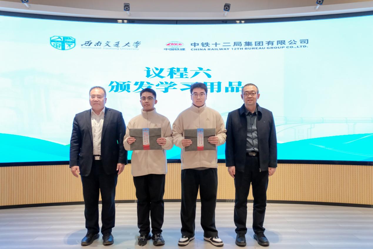 中铁十二局集团第二工程公司党委副书记、工会主席全峰涛、西南交通大学大学生就业指导中心副主任董鹏飞为“实干创业班”学生代表颁发学习用品。