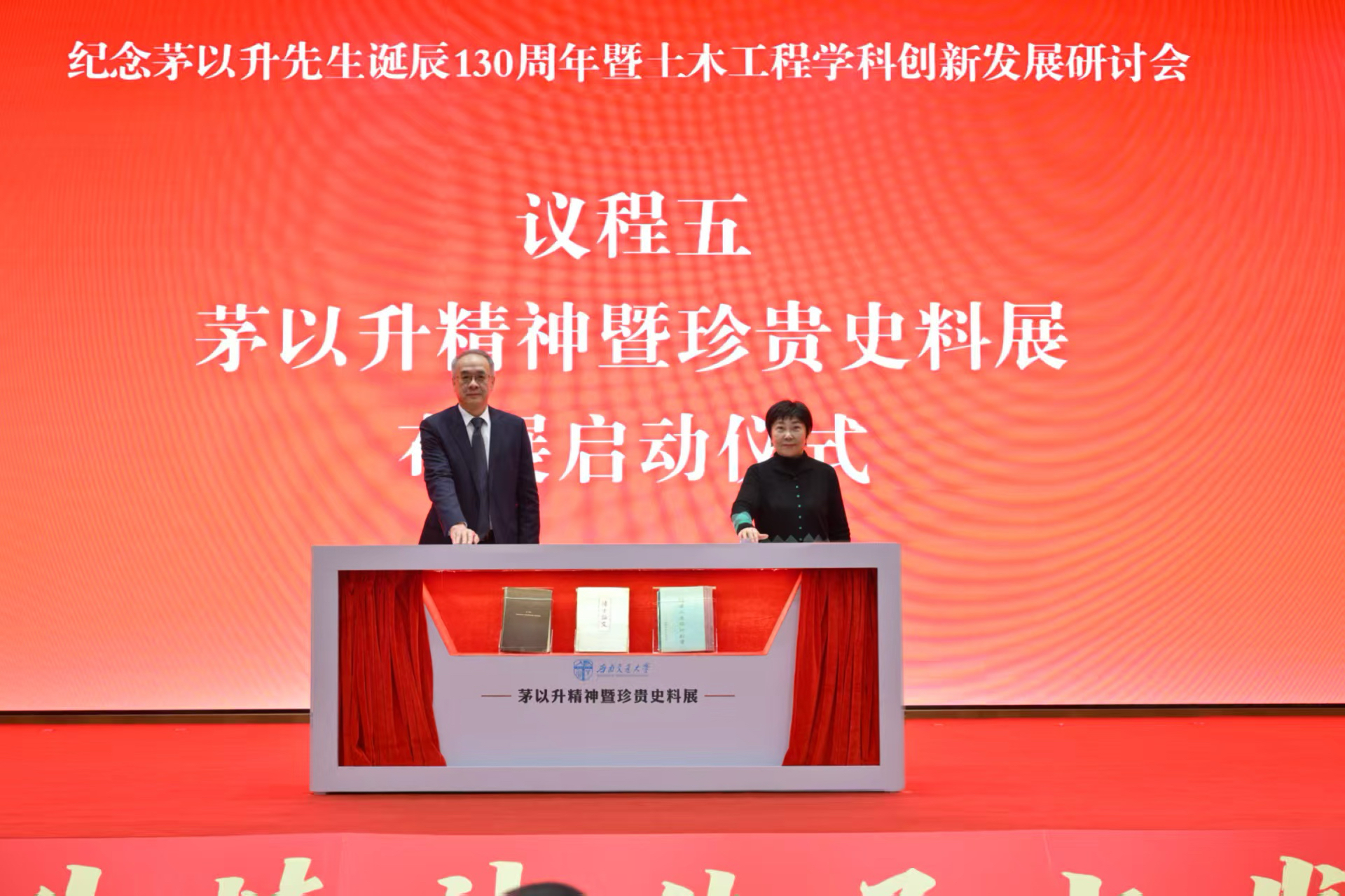 现场举行“茅以升精神暨珍贵史料展”启动仪式。余敏明、茅玉麟共同为布展揭幕。现场展柜展示茅以升先生“博士论文答辩本原件”“康奈尔大学硕士论文原件”和“《钱塘江建桥计划书》原件”三本珍贵史料,其中博士论文答辩本为国内孤本,也是首次在国内公开展示。这些文献见证并辉映着茅以升先生求学报国、笃行建功的光辉一生,具有独一无二的学术价值与精神力量。后续,以茅以升珍贵史料为核心的“茅以升精神暨珍贵史料展”将在西南交通大学东部(国际)校区正式实地开展。
