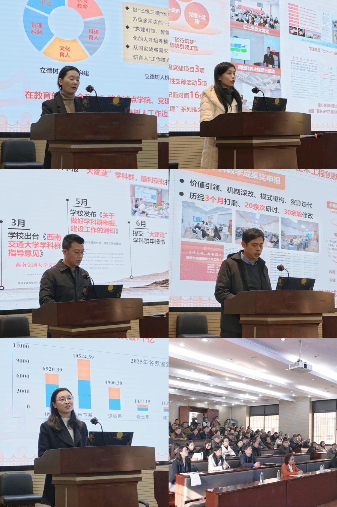 学生工作“四大平台”“三大链条”展开工作述职;副院长陈嵘围绕学科建设,人才引育,实验室安全、实验教学与科创竞赛等方面进行工作述职;副院长徐腾飞围绕重点专项工作、本科生培养、研究生培养、工作规划等方面进行工作述职;副院长于丽围绕科研与合作交流等方面进行工作述职。各分管领导围绕分管工作,梳理亮点、反思不足,并明确2026年改进方向。