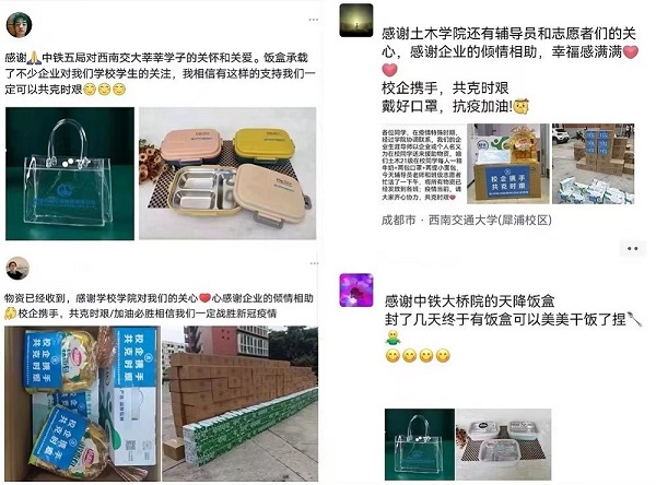 与此同时,中铁大桥院全体校友情系蓉城、心系学子,为足球盘 全体硕博研究生捐赠2650个保鲜饭盒,积极助力学校疫情防控工作,校友们纷纷表示“母校是永远的家,作为交大土木人,校友们时刻不忘母校的培养之恩,通过捐赠物资支持母校工作,希望与全体师生同心戮力,共克时艰。”