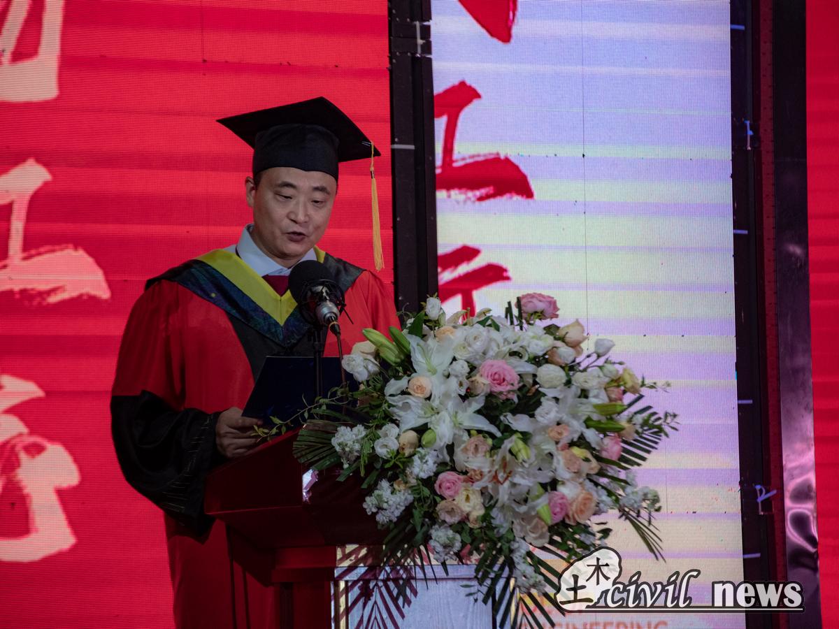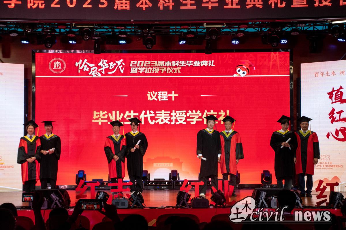 随后进行毕业生代表毕业证书颁发仪式与授学位礼。陈嵘及勾红叶为毕业生代表颁发毕业证书。蒲黔辉、高平平、富海鹰、王明年为毕业生代表授学位礼,热烈祝贺毕业生们顺利取得工学学士学位。