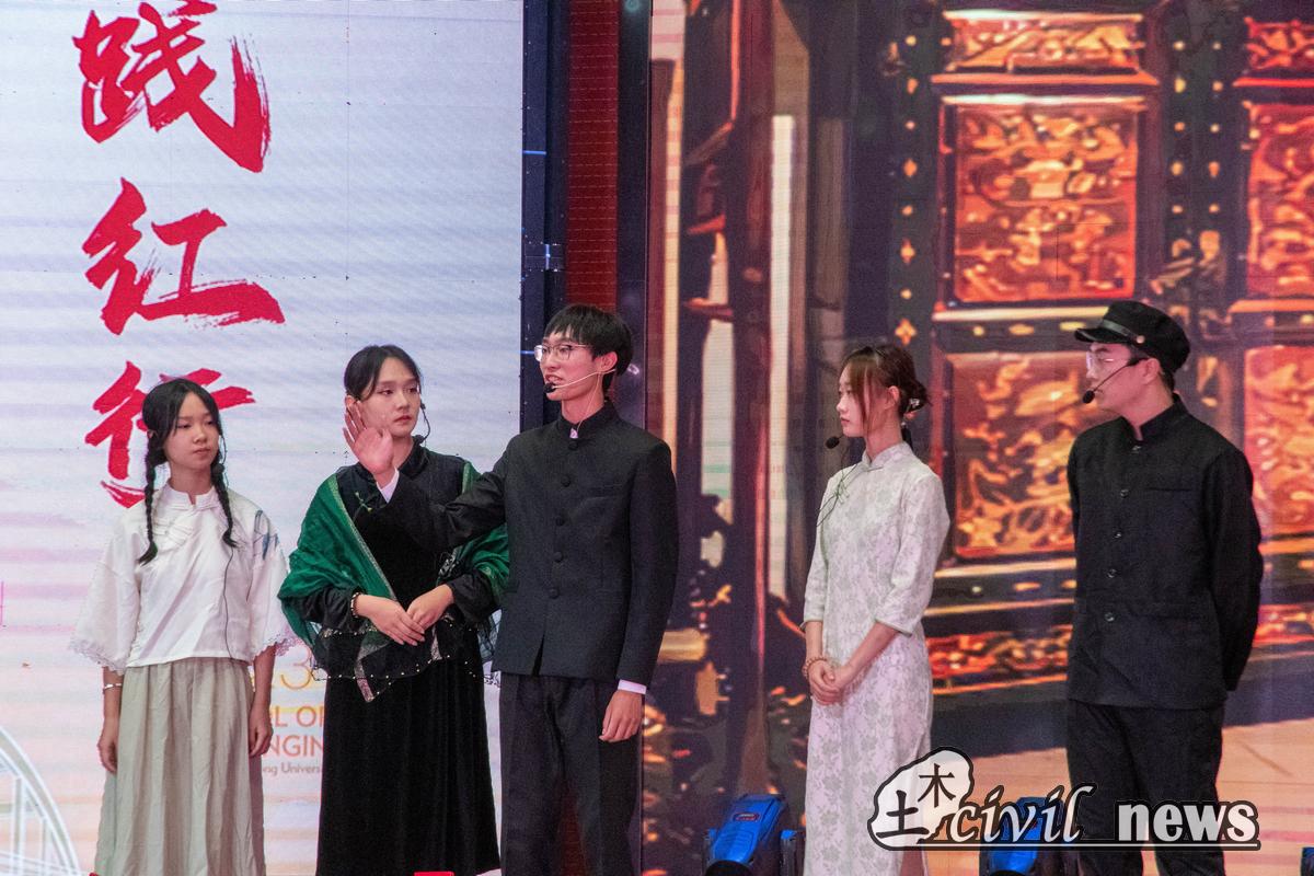 此后,“恰风华正茂”主题晚会正式开始。热辣的开场舞《feel special》瞬间引燃全场,开启晚会第一篇章“植红心,扬红志”;歌曲《你曾是少年》追忆青春的约定;器乐合奏《送我一枝玫瑰花》刻画了少年的青涩勇敢、温暖热烈;话剧《茅以升》传递了校友茅以升砥砺前行、迎难而上的报国精神;歌曲串烧《风过青春》展现了青年热情洋溢、朝气蓬勃的精神风貌。