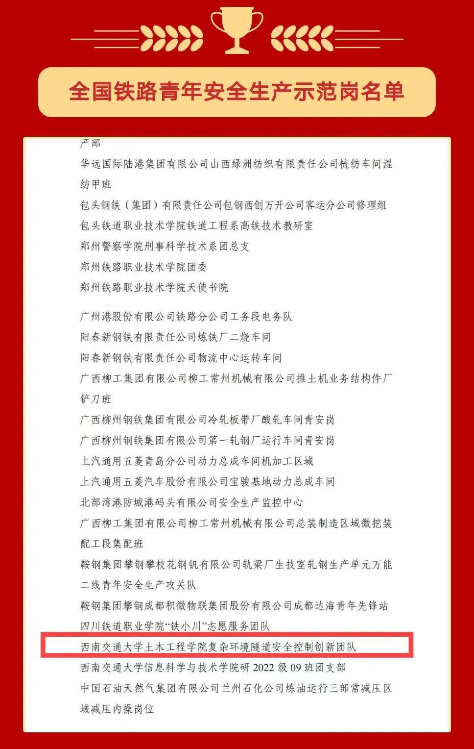 树立典型,激励奋进,进一步促进青年成长成才,经全国铁道团委评审决定,足球盘-足球让球盘 复杂环境隧道安全控制创新团队荣获“全国铁路青年安全生产示范岗”。