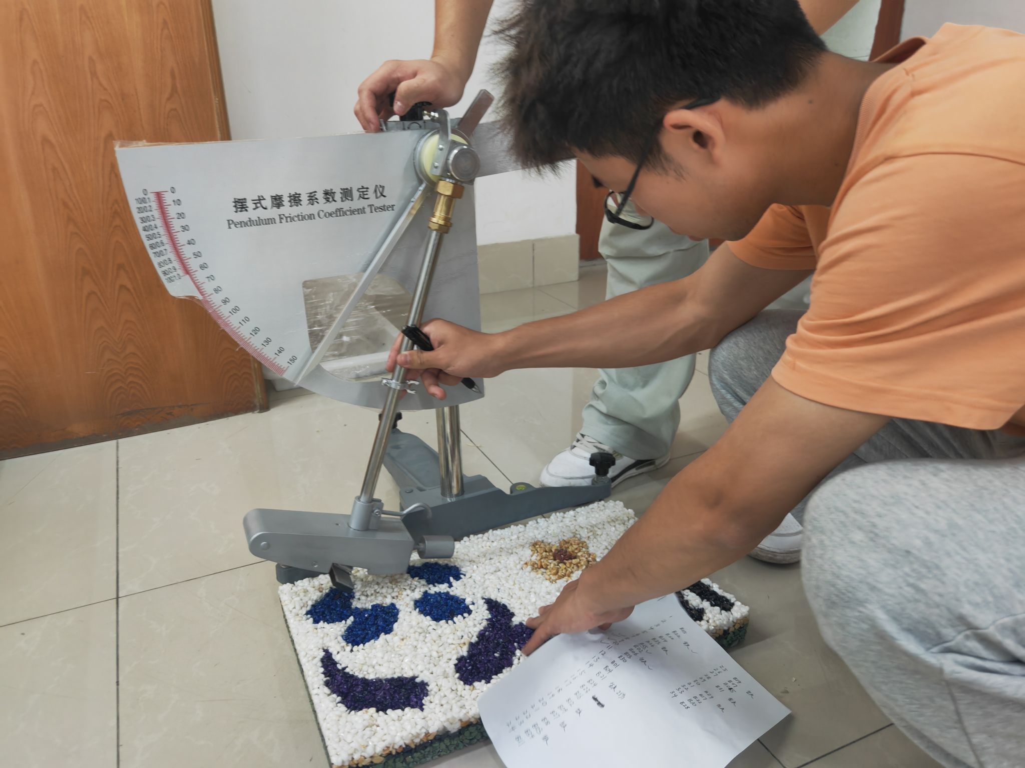 答辩结束后,比赛进入实际加载环节,各小组带上自己的模型,分别进行透水性、抗剥落性以及抗性测试,并由科创中心相关的负责人员对透水程度、设备转动角度、进行记录,以此对模型的各项性质做出判断。